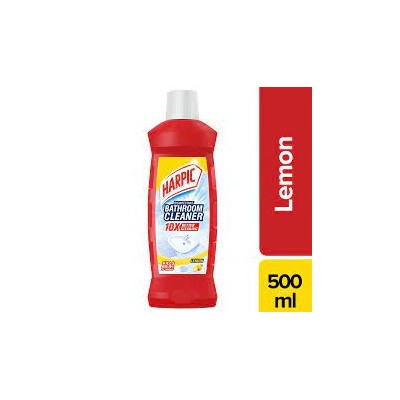 Harpic Bathroom Lemon 500 Ml gives you unbeatable cleaning on greasy soil and particulate matter and Harpic freshness for the whole bathroom. Its thick liquid formula with powerful cleaning agents removes tough stains and kills 99.9 percent of germs. Harpic Bathroom Lemon 500 Ml also gives your bathroom a pleasant fresh fragrance. Harpic Bathroom Lemon 500 Ml is Used for regular cleaning of bathroom floor and tiles. Use 1.5 capfuls in half bucket of water. For tough stains and sink. Use diluted to clean for best results. Then scrub gently and rinse. For Tough Stains and Sink – Use diluted to clean for best results. Then scrub gently and rinse. For Disinfection of Bathroom Floor, Tiles and Sink – Use undiluted for best results or dilute using 5 capfuls in half bucket of water (4 litres). Apply on surface, leave for 5 minutes then scrub gently and rinse. Apply on surface, leave for 5 minutes then scrub gently and rinse. Suitable for most bathroom surfaces. Do not use on aluminium, brass and copper. Always spot check on a small, hidden area before using. Always use Harpic bathroom cleaner separately. Do not mix with other products. Don’t directly use the liquid on marble tiles as it will make spot on the tile, always dilute before using.